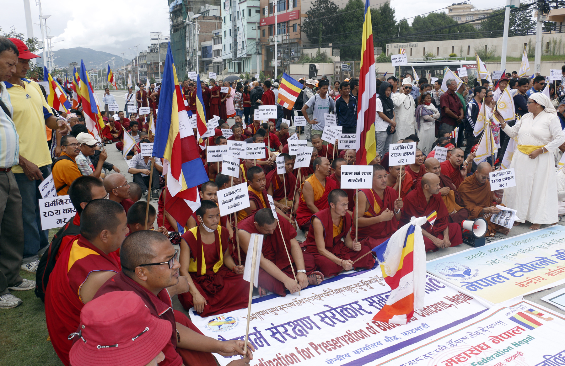 काठमाडौँ । विभिन्न धर्मका अनुयायीहरुले अन्तरिम संविधान, २०६३ मा व्यवस्था भए अनुसार नयाँ संविधानमा पनि ‘धर्म निरपेक्षता’लाई कायमै राख्नुपर्ने माग गर्दै आज दिनभर नयाँ बानेश्वर क्षेत्रमा धर्ना दिए । बौद्ध, किराँत, इस्लाम, ख्रिष्टियन, बोनधर्मसम्बद्ध धर्मावलम्बीहरुले जाति समुदायगत पहिचानमा आधारित सङ्घीयता, समानुपातिक समावेशी प्रतिनिधित्वलगायत उत्पीडित जाति समुदायको अधिकारलाई संविधानमा स्थापित गर्न दबाब स्वरुप धर्ना कार्यक्रम गरेका हुन् । सोही क्षेत्रमा उनीहरु भोलि पनि यसरी नै धर्नामा बस्ने कार्यक्रम छ । अखिल नेपाल भिक्षु महासङ्घका महासचिव भिक्षु कोण्डन्यले संविधानमा धार्मिक स्वतन्त्रता मात्र भएर विविध धर्मका अनुयायीहरुको भावना मुखरित नहुने भएकाले अन्तरिम संविधानमा व्यवस्था भएअनुसार ‘धर्म निरपेक्षता’ नै कायम गर्नुपर्ने बताए । कार्यक्रममा आदिवासी जनजाति राष्ट्रिय आन्दोलनका तर्फबाट डा महेशमान श्रेष्ठले नयाँ बन्ने संविधानमा सबै भाषाभाषी, जनजातिको पहिचान र अधिकारलाई स्थान दिइनुपर्ने बताए । धर्नामा आदिवासी जनजाति राष्ट्रिय आन्दोलन, नेपाल, संयुक्त मधेसी राष्ट्रिय आन्दोलन समिति, राष्ट्रिय मुस्लिम सङ्घर्ष गठबन्धन, समृद्ध मधेश नागरिक अभियान, खसान राष्ट्रिय सङ्घर्ष समितिको पनि सहभागिता रहेको थियो । धर्ना कार्यक्रममा सहभागी सबै धर्मावलम्बीले आ–आफ्नो धर्म अनुसारका पोशाक लगाएका थिए । उनीहरुले आ–आफ्नो धर्म झल्काउने झण्डा समेत बोकेका थिए ।