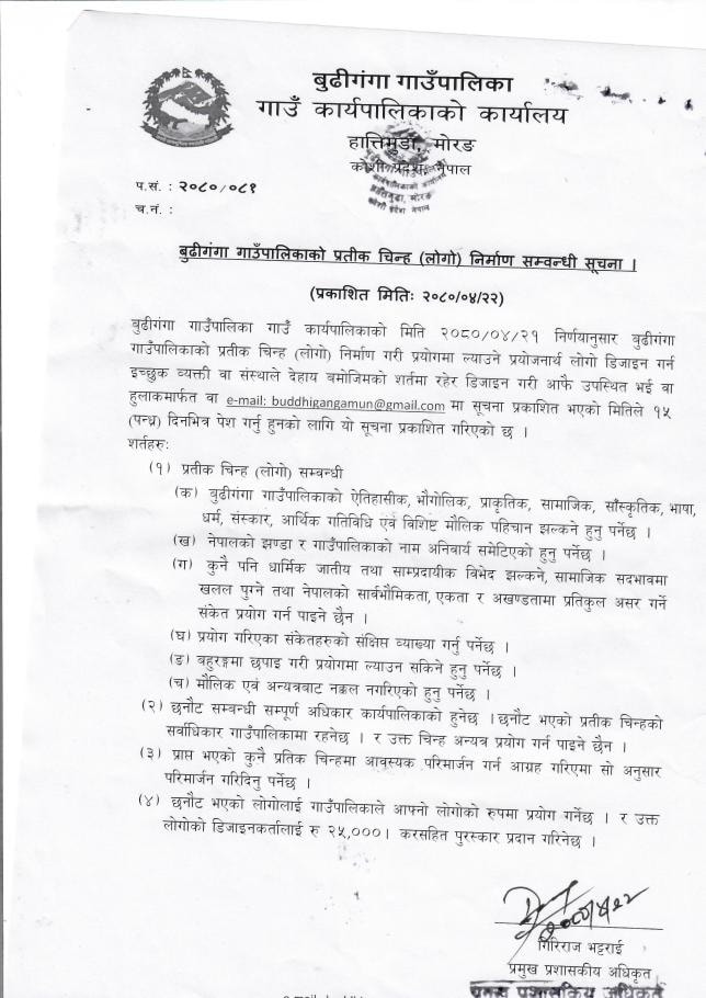 मोरङ । मोरङको बुढीगंगा गाउँपालिकाले आफ्नै प्रतीक चिन्ह (लोगो) प्रयोगमा ल्याउने भएको छ । २०८० साल श्रावण २१ गते बसेको कार्यपालिका बैठकको निर्णयअनुसार लोगो निर्माणका लागि सार्वजनिक सूचना जारी गरिसकेको छ ।