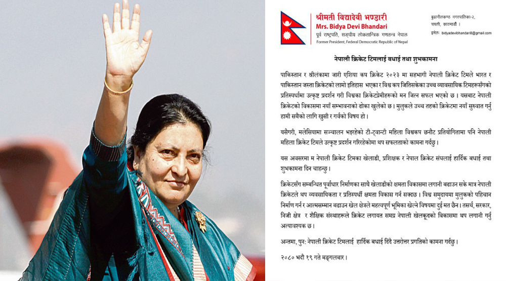 यसैगरी पूर्वराष्ट्रपति भण्डारीले मलेसियामा जारी आइसिसी महिला ट्वान्टी–२० विश्वकप एसिया क्षेत्र छनोटमा नेपाली महिला टोलीले उत्कृष्ट खेल प्रर्दशन गरेकामा बधाई दिँदै थप सफलताको कामना गरेकी छन् ।
