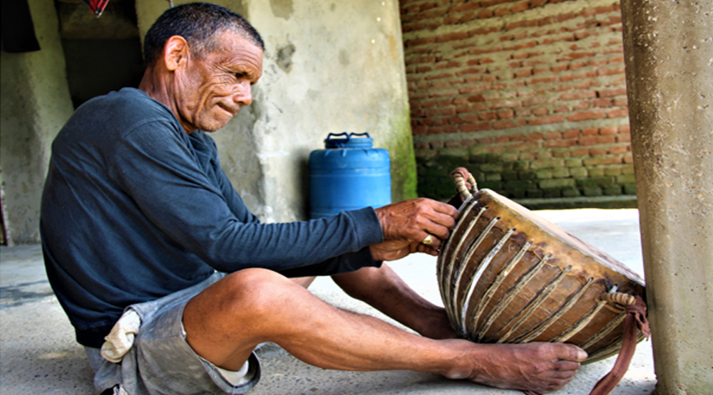 बाँके । “मैले १२ वर्ष उमेरदेखि दमाह, मादल र ट्याम्का बनाउन सुरु गरेको हुँ”, बाँके कोहलपुर–१३ भरैयाका ५७ वर्षीय पस्तोके बादीले भने, “मेरा लागि आजसम्म पनि जीविकोपार्जनका लागि यही माध्यम बनेको छ ।”