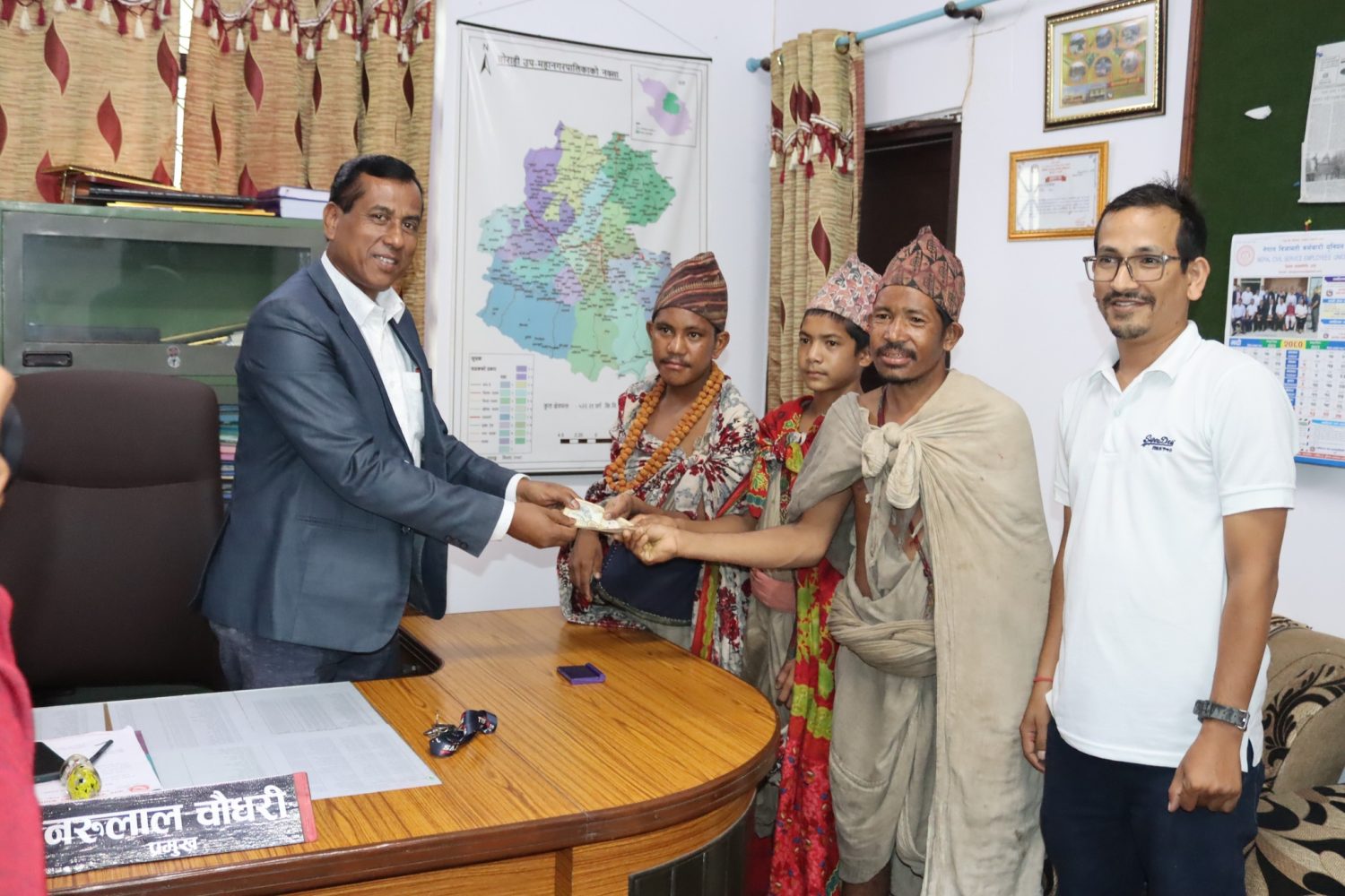 नगर प्रमुख नरुलाल चौधरीले राउटेहरु लालबहादुर शाही, बिर्खे शाही र जीवन शाहीलाई १५ हजार रुपैयाँ नगद दशै खर्च उपलब्ध गराएका हुन् ।