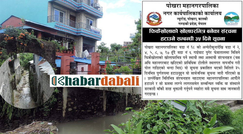 पोखरा । सीमांकन टोलीले प्रतिवेदन बुझाएको एक महिनापछि पोखरा महानगरपालिकाले फिर्के खोलाको क्षेत्रभित्र बनेका संरचना हटाउन ३५ दिने सूचना जारी गरेको छ । महानगरपालिकाले शुक्रबार सूचना जारी गर्दै खोला बहाव क्षेत्रमा बनेका संरचना ३५ दिनभित्र हटाउन आग्रह गरेको हो ।
