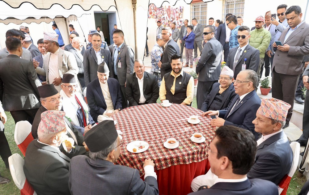 एमालेको केन्द्रीय कार्यालय, च्यासल, ललितपुरमा जारी चियापानमा पुगेका प्रधानमन्त्री एवं नेकपा माओवादी केन्द्रका अध्यक्ष प्रचण्ड र पूर्व प्रधानमन्त्री तथा नेपाली का्रग्रसका सभापति देउवालाई एमालेका अध्यक्ष ओलीलगायत नेताहरुले स्वागत गरेका थिए ।