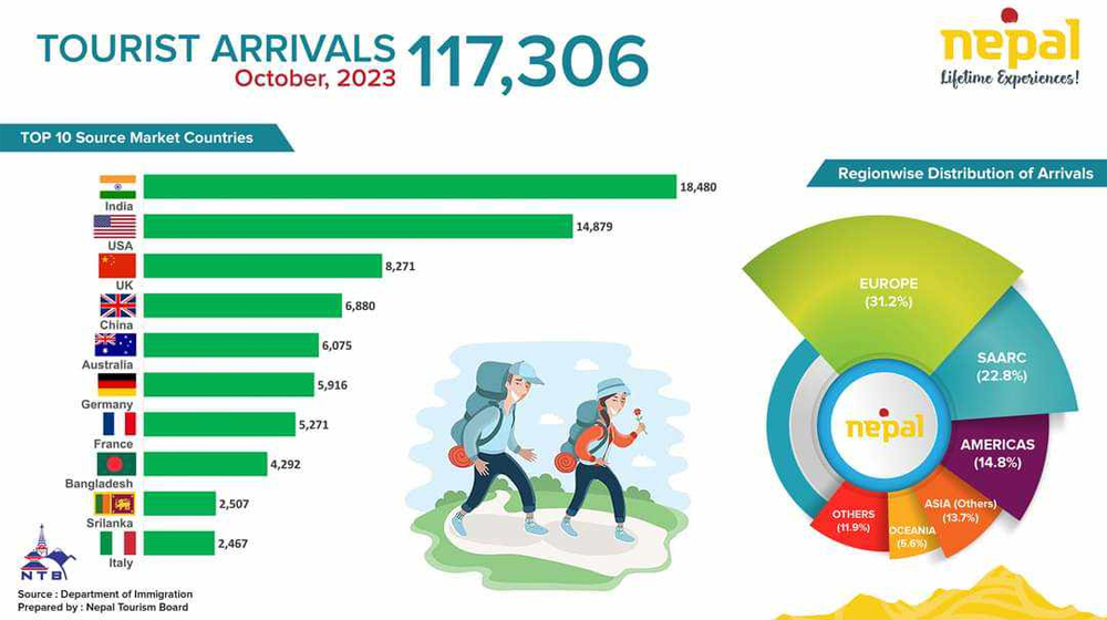 बोर्डका अनुसार अक्टोबर महिनामै १ लाख १७ हजार पर्यटक भित्रिएका छन् । यसमध्ये सबैभन्दा धेरै छिमेकी भारतबाट १८ हजार ४८० जना पर्यटक भित्रिएका छन् ।