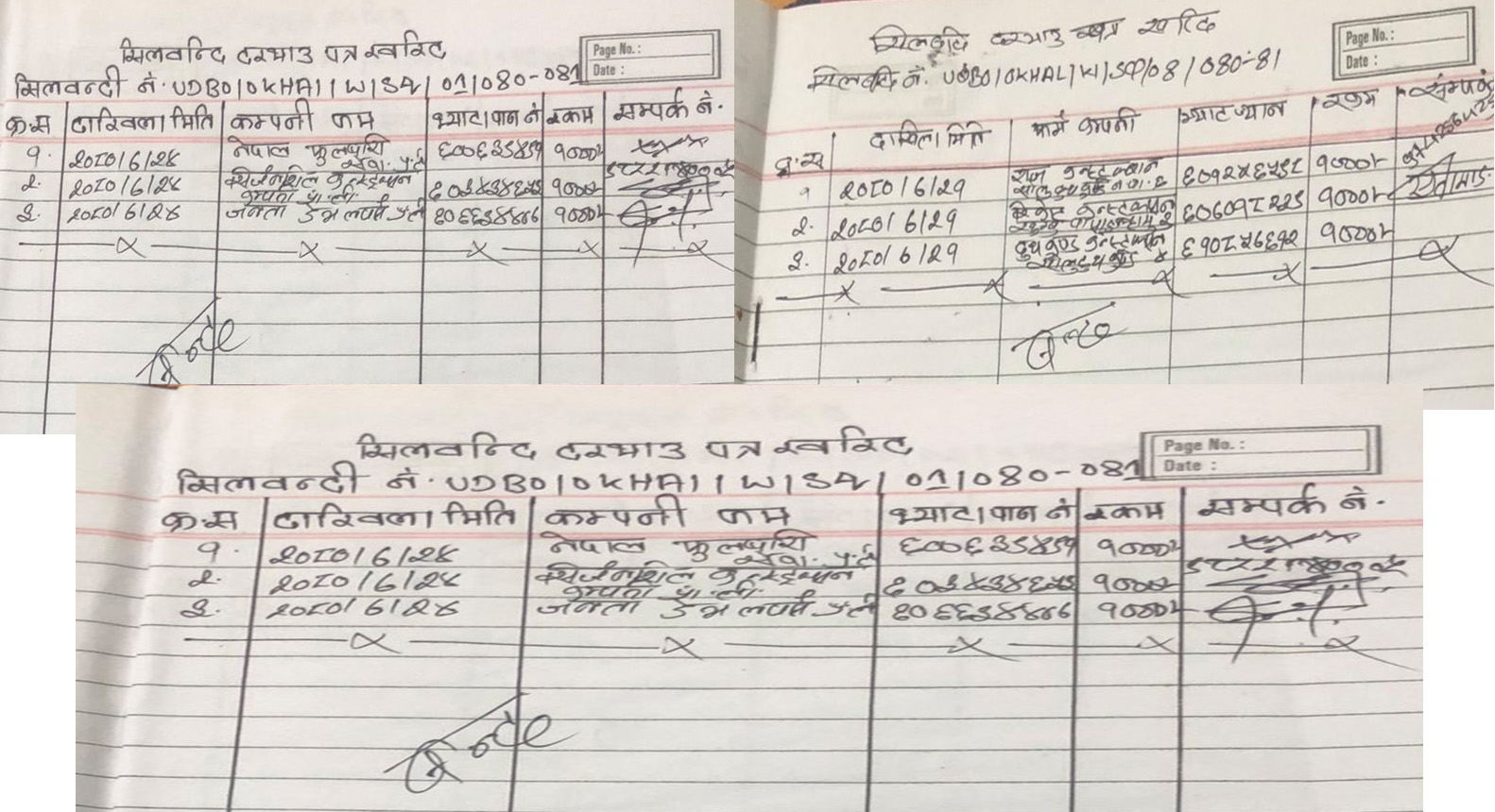 एक ठेक्काका लागि ३ वटा फर्मको प्रतिस्पर्धा अनिवार्य भएकाले मिलेमतोमा ल्याइएका फर्महरुको विवरण । ८ वटै ठेक्कामा ३ वटाको मात्र दर्ता गरिएको अभिलेख छ ।