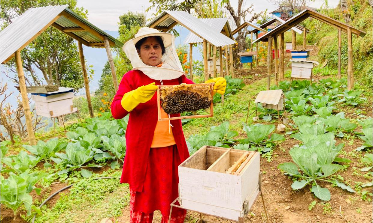 गलकोट । बागलुङ नगरपालिका- १२ अमलाचौरस्थित चोलादेवी पाठक आफ्नो घरमुनिको बारीमा मौरीको स्याहारमा व्यस्त छन् । उनले यो काम गर्न थालेको तीन वर्ष पुगिसक्यो । उनले भनिन्,’बाख्रापालन र मौरीपालन एकसाथ थालनी गरेककी हुँ । यसमा श्रीमान्को साथ र सहयोग पनि रहेको छ ।’
