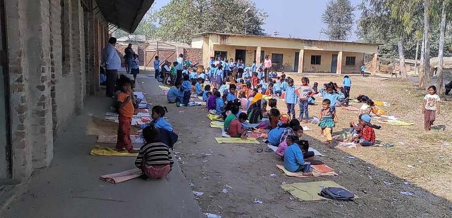 तर, बाराको आदर्श कोटवाल गाँउपालिका–५ मा रहेको नेरा आधारभुत टेढाकट्टी विद्यालयका सयौँ बालबालिका अध्ययनरत सो विद्यालयमा टेबल र बेञ्च नभएपछि बालबालिका आ–आफ्ना घरबाट नै बोरा बोकेर विद्यालय धाउने गरेका छन् ।
