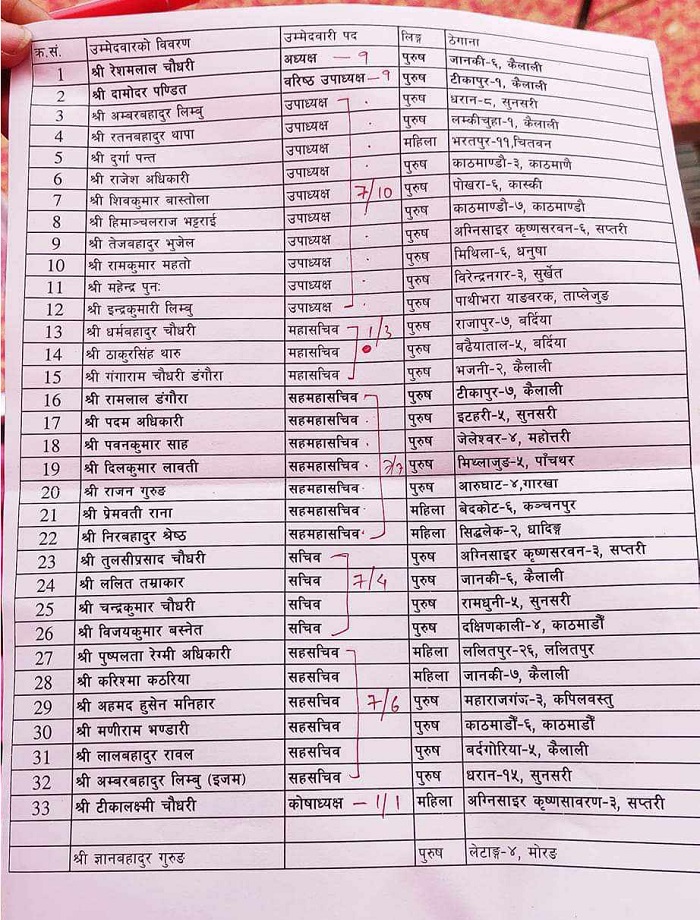 त्यस्तै, ७ पदको उपाध्यक्षमा १० जनाको उम्मेदवारी परेको छ । १ जनाको पद रहेको महासचिवमा ३ जनाको उम्मेदवारी परेको छ । ७ जना सहमहासचिवमा ७ जनाकै उम्मेदवारी रहेको छ । सचिवमा ४ जनामा ४ जनाको उम्मेदवारी छ भने सहसचिवका ७ पदमा ६ जनाको उम्मेदवारी रहेको छ ।