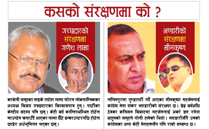 काभ्रेका सञ्जीव लामा, अजयमान श्रेष्ठलाई कांग्रेस नेताहरूले संरक्षण दिँदै आएका छन् । काठमाडौंका पुराना डन राजु गोर्खाली कांग्रेस पृष्ठभूमिका भए पनि उनको सम्बन्ध एमाले नेताहरूसँग समेत छ ।