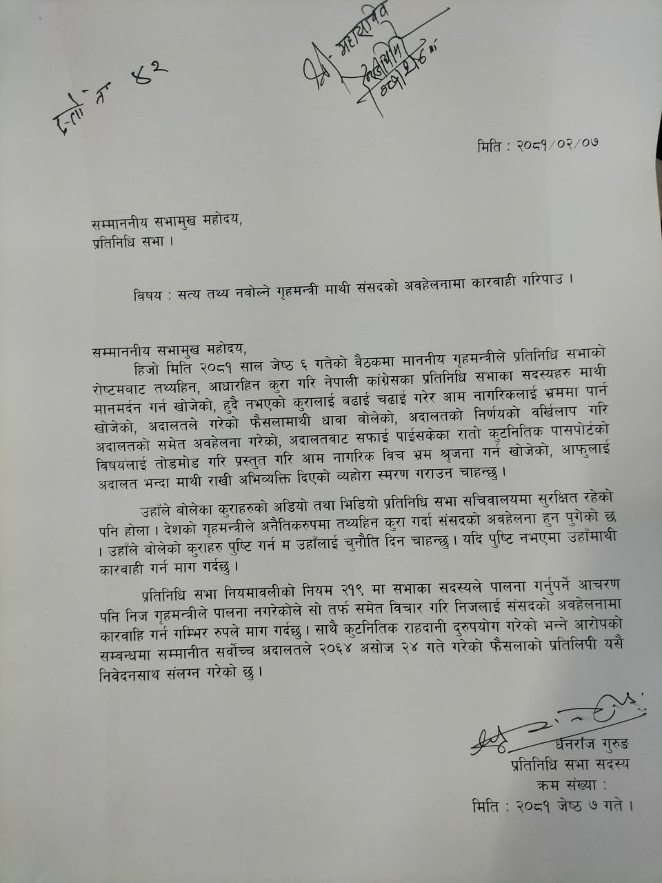 काठमाडौं । नेपाली कांग्रेस उपसभापति धनराज गुरुङले उपप्रधान तथा गृहमन्त्री रवि लामिछानेलाई कारवाहीको माग गर्दै संसद सचिवालयमा निवेदन दिएका छन् ।