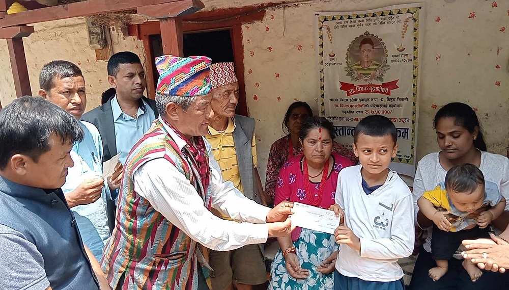 मृतकका दुई छोरा नौ वर्षीय दिशन र छ महिनाका इशान बुढाथोकीको पठनपाठनका लागि उनीहरूको नाममा छुट्टाछुट्टै बैंक खाता खोलेर जम्मा गर्नेगरी रु तीन–तीन लाख तथा घरखर्चका लागि बुबा जीतबहादुर, आमा रत्नकुमारी र श्रीमती सरस्वती बुढाथोकीलाई नगद रु ५०–५० हजार उपलब्ध गराइएको हो।
