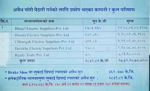 काठमाडौं । ब्रेक सु र इलेक्ट्रोनिक सामानमा लुकाएर ३२ क्विन्टल सुन तस्करी भएको निष्कर्ष प्रहरीले निकालेको छ ।