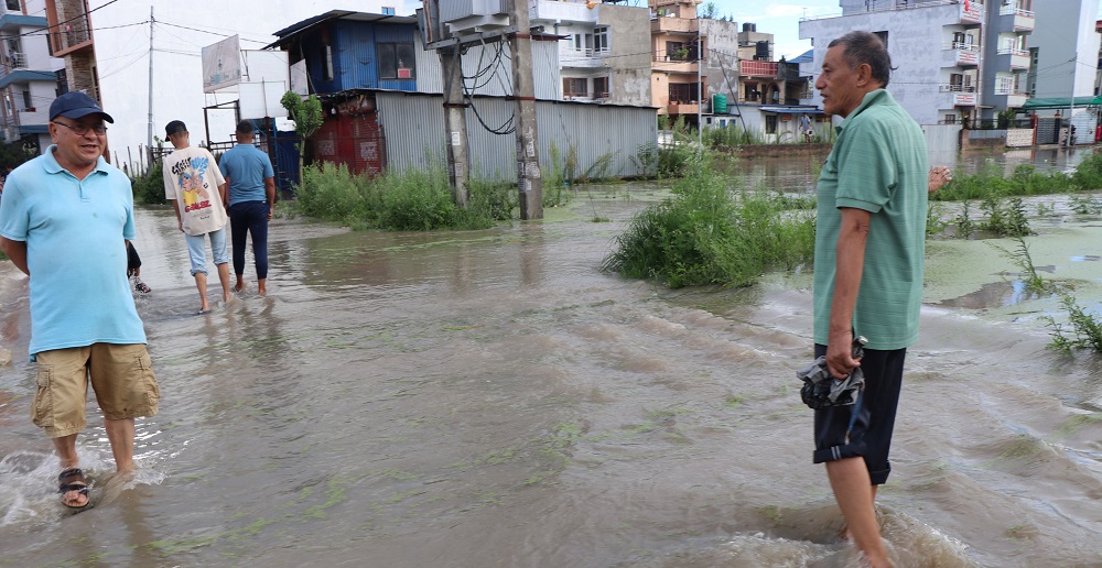 भक्तपुर। मध्यपुरथिमि नगरपालिका‐५ राधेराधे, सङ्गम कोलोनी, कमेरोटार जग्गा एकीकरण आयोजनाभित्रको तल्लो क्षेत्रका बासिन्दा गएरातिदेखि नै बाढीबाट प्रभावित भए । बस्तीभित्र बाढी पसेपछि सुरक्षित स्थानमा घरका सामान सार्ने र आफ्ना सवारीसाधन उच्चस्थानमा सार्नमै उनीहरू व्यस्त रहे ।