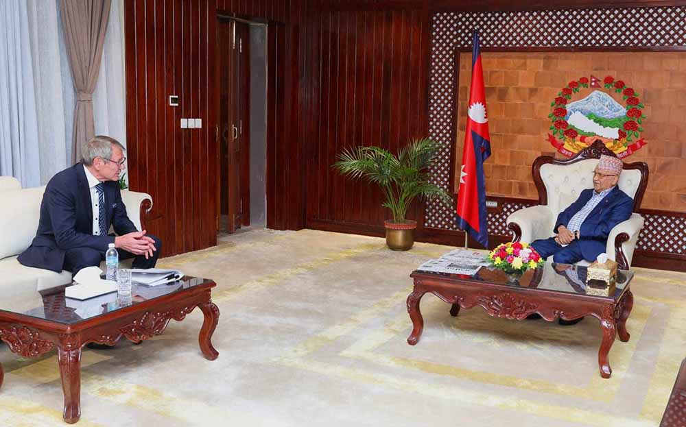 काठमाडौं । प्रधानमन्त्री केपी शर्मा ओलीसँग नेपालका लागि जर्मनीका राजदूत डा. थोमस पिन्जले शुक्रबार शिष्टाचार भेट गरेका छन् ।