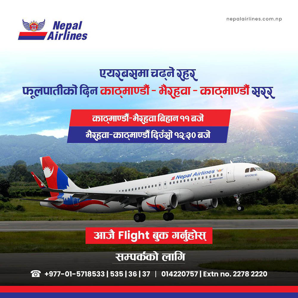 काठमाडौं । नेपाल एयर लाइन्सले फूलपातीको दिन काठमाडौं-भैरहवा-काठमाडौं उडान गर्ने भएको छ ।