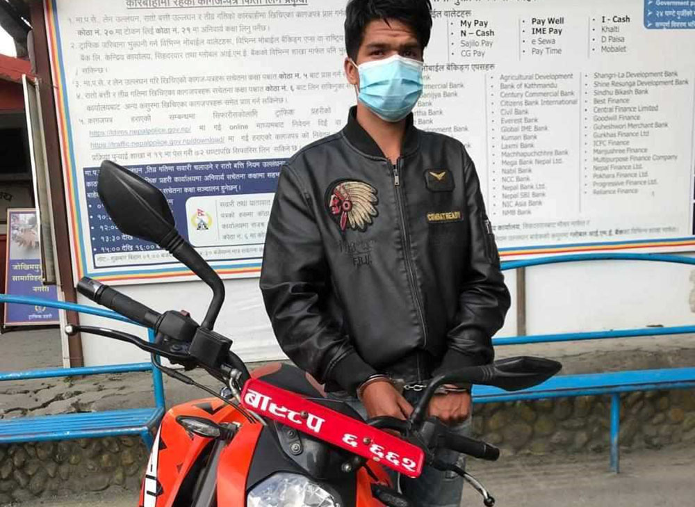 काठमाडौं । भक्तपुरको मध्यपुर ठिमी नगरपालिका २ बाट विहिबार मोटरसाइकल चोरीमा संलग्न एक जनालाई ट्राफिक प्रहरीले नियन्त्रणमा लिएको छ ।