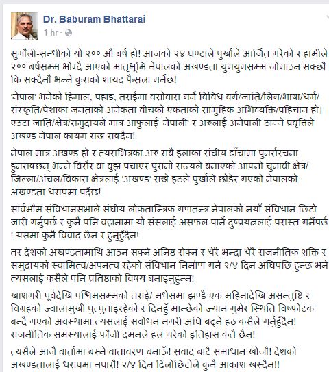\"BRB\"काठमाडौं । पूर्व प्रधानमन्त्री, एमाओवादी नेता एवं संवैधानिक राजनीतिक संवाद तथा सहमति समितिका सभापति डा. बाबुराम भट्टराईले अबको २४ घण्टामा नेपाल अखण्ड रहने वा नहरने भन्ने विषयको टुंगो लाग्ने बताएका छन । आन्दोलनरत दलसँग वार्ता गर्नका लागि संविधान निर्माण प्रक्रिया राेक्न पहल गरेका डा. भट्टराईले यो वर्ष सुगौली सन्धी भएको २०० औं वर्ष भएको स्टाटस आफ्नो फेसबुक पेजमा उल्लेख गर्दै भनेका छन् ‘आजको २४ घण्टाले पुर्खाले आर्जित गरेको र हामीले २०० बर्षसम्म भोग्दै आएको मातृभूमि नेपालको अखण्डता युगयुगसम्म जोगाउन सक्छौं कि सक्दैनौं भन्ने कुराको शायद फैसला गर्नेछ !’ नेपाल\' भनेको हिमाल, पहाड, तराईमा वसोवास गर्ने विविध वर्ग/जाति/लिंग/भाषा/धर्म/संस्कृति/पेशाका जनताको अनेकता वीचको एकताको सामुहिक अभिव्यक्ति/पहिचान हो।एउटा जाति/क्षेत्र/समुदायले मात्र आफुलाई \'नेपाली\' र अरुलाई अनेपाली ठान्ने प्रवृत्तिले अखण्ड नेपाल कायम राख्न सक्दैन!\' भन्दै उनले सबैलाइ हठ त्याग्न आग्रह गर्दै भनेका भनेका छन्, \'नेपाल मात्र अखण्ड हो र त्यसभित्रका अरु सबै इलाका संघीय ढाँचामा पुनर्संरचना हुनसक्छन् भन्ने विर्सेर वा वुझ पचाएर पुरानो राज्यले बनाएको आफ्नो चुनावी क्षेत्र/ जिल्ला/अंचल/विकास क्षेत्रलाई \'अखण्ड\' राख्ने हठले पुर्खाले छोडेर गएको नेपालको अखण्डता धरापमा पर्दैछ!\'   भोलिदेखि संविधानसभाको प्रक्रिया सुरु हुने भन्दै आजै वार्ताको वातावरण बनाउनुपर्ने र दुई चार दिन ढिलाई गर्दा आकाश नखस्ने पनि स्टाटसमा उल्लेख गरेका छन् । यसअघि पनि नेता भट्टराईले आन्दोलनरत पक्षलाई उचालिरहेको आरोप लागेको थियो ।