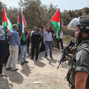 विवादित जमिन आफ्नो भएको बताउँदै आफ्नो जमिनको सर्वस्वहरण गर्दै आफुहरुलाई आफ्नो जमिनबाट हट्न बाध्य गराएको विरुद्धमा इजराइली शैनिक विरुद्ध वेस्ट बैङक नजिकै नारा जुलुस गर्दै प्लेस्टाइनीहरु । तस्विरः सिन्हुवा \"palistani\"