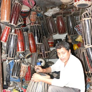 काठमाडौँ नरदेवीस्थित पसलमा खिं बाजा मर्मत गर्दै व्यापारी । उक्त पसलमा मादल, खिं, तबलालगायतका बाजाहरु बनाएर बिक्री गरिन्छ । तस्बिर / रत्न श्रेष्ठ, रासस \"baja_marmat\"