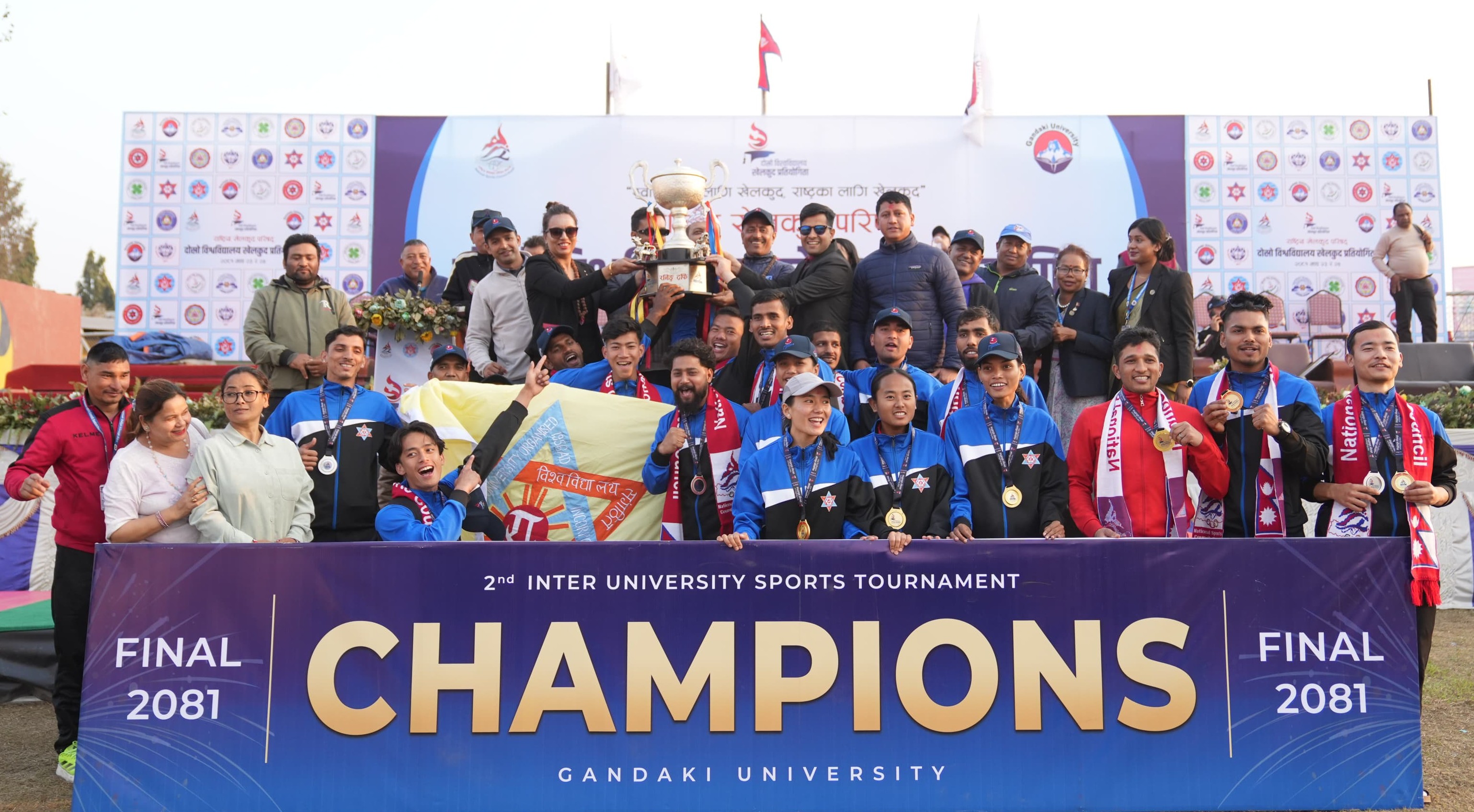 काठमाडौं । दोस्रो विश्वविद्यालय खेलकुद प्रतियोगितामा त्रिभुवन विश्वविद्यालय टिम च्याम्पियन बन्न सफल भएको छ । पोखरामा बिहीबार सम्पन्न प्रतियोगितामा त्रिभुवन विश्वविद्यालय १३ स्वर्ण पदकसहित टिम च्याम्पियन बनेको हो ।