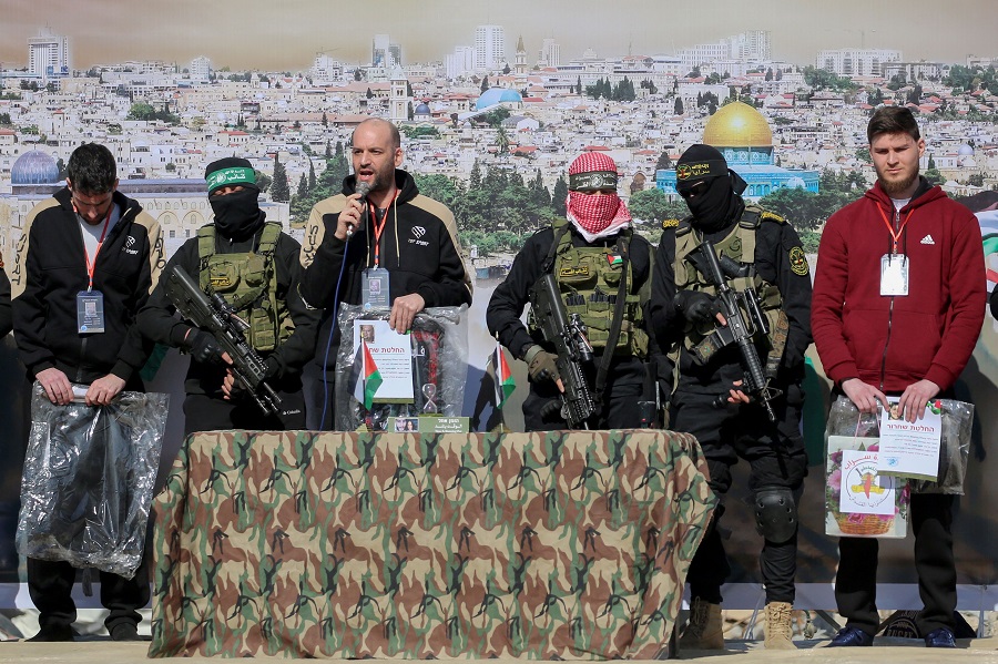 हमासका नकाबधारी लडाकूहरूले गाजाको दक्षिणी सहर खान युनिसको एक मञ्चमा बन्धकहरूलाई परेड गराएपछि उनीहरूलाई रेडक्रसलाई हस्तान्तरण गर्नुअघि भीडलाई सम्बोधन गर्न भनिएको थियो । आफ्ना अपहरणकारीहरूले दिएको उपहारको झोला र आफ्नो कैदको अन्त्यको प्रमाणपत्र समातेर लडाकुहरूको साथमा रहेका तीनै जनाले युद्धविराम सम्झौताअन्तर्गत थप बन्धक आदानप्रदान पूरा गर्न आह्वान गरेका थिए ।