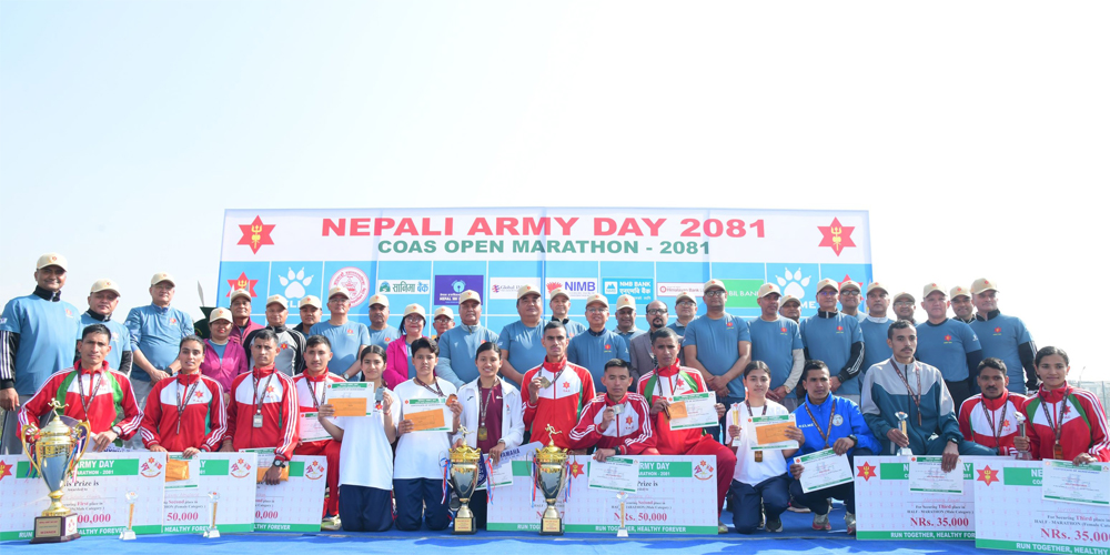 सैनिक मुख्यालय परिसरस्थित खेल मैदानमा शनिबार भएको प्रतियोगितामा हाफ म्याराथन २१ किमी पुरुषतर्फ सेनाकी मुकेश पाल र महिलातर्फ धादिङकी सन्तोषी श्रेष्ठ च्याम्पियन बनिन । उपाधिसँगै म्याराथन विजेता खड्काले तीन लाख रुपियाँ पुरस्कार पाए ।
