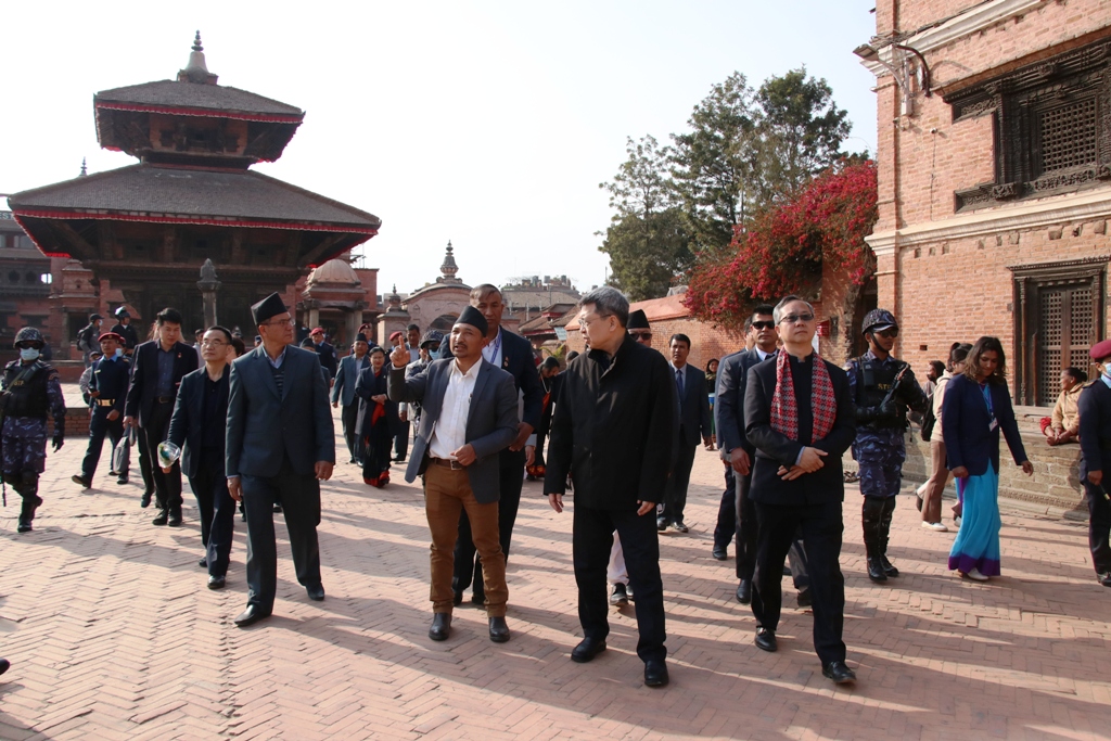 भक्तपुर । जनवादी गणतन्त्र चीनको राष्ट्रिय जनजाति मामिला आयोगका मन्त्री फान यूएको नेतृत्वमा ६ सदस्यीय प्रतिनिधिमण्डलले आइतबार भक्तपुरको अवलोकन भ्रमण गरेका छन् । विश्व सम्पदा सूचिमा सूचिकृत भक्तपुर दरबार स्क्वायरमा अवस्थित ऐतिहासिक एवम् सांस्कृतिक सम्पदाहरुको टोलीले अवालोकन भ्रमण गरेको हो ।