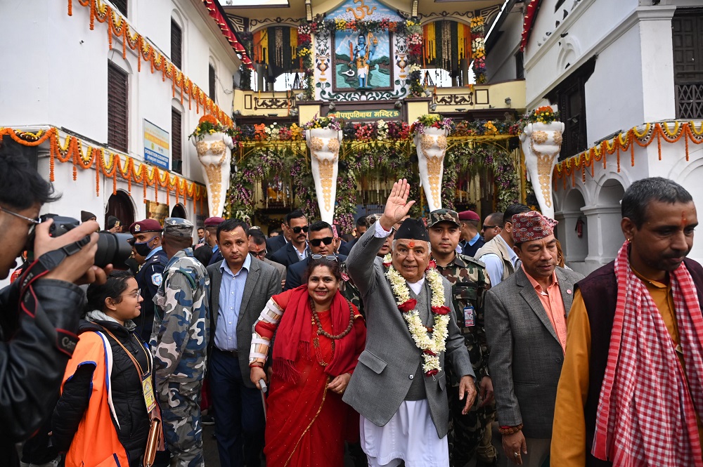 उनलाई पशुपतिनाथ मन्दिरका मूल भट्टले चन्दन र फूलप्रसाद प्रदान गरेका थिए । मन्दिर परिसरमा राष्ट्रपति पौडेललाई पशुपति क्षेत्र विकास कोष सञ्चालक परिषद्का अध्यक्षसमेत रहेका संस्कृति, पर्यटन तथा नागरिक उड्डयनमन्त्री बद्री पाण्डे, मन्त्रालयका सचिव तथा कोषका पदाधिकारी, स्थानीय नियकायका प्रतिनिधि, गुठी संस्थानका उच्चपदस्थ अधिकारीलगायतका कर्मचारीले स्वागत गरेका थिए ।