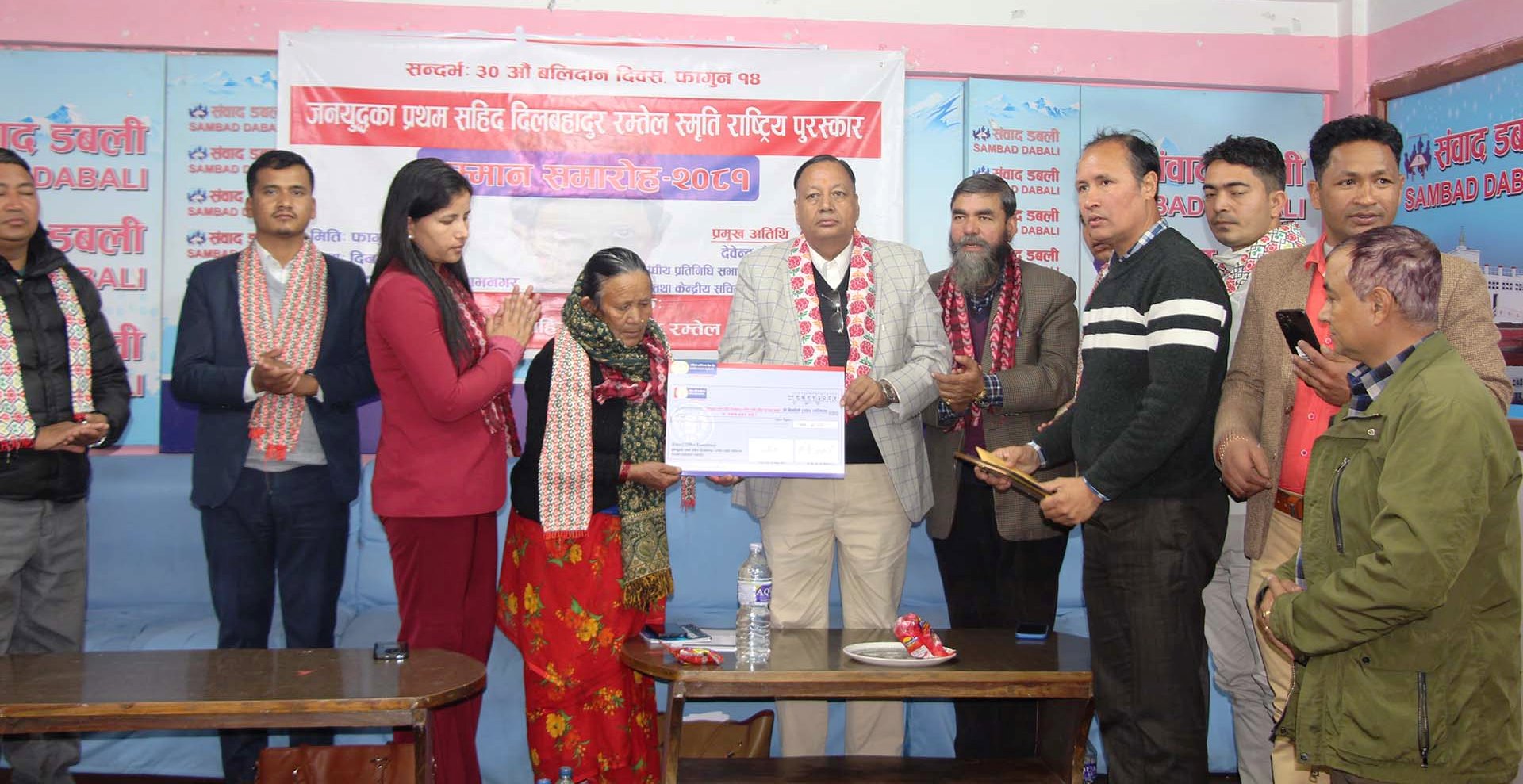 काठमाडौं । ‘दिलबहादुर रम्तेल स्मृति राष्ट्रिय पुरस्कार’ जनयुद्धका प्रथम सहिद दिलबहादुर रम्तेलका आमा किर्कौली रम्तेल (सरिमाया)लाई लाई प्रदान गरिएको छ ।