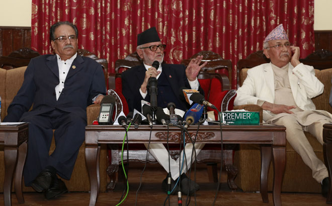 \"Prachand,-Sushil-and-KP-Oli\"काठमाडौं । नयाँ संविधान घोषणा हुनुभन्दा एक दिन अगाडि प्रमुख तीन दलले असन्तुष्ट दलहरुलाई पुनः वार्तामा आउन संयुक्त आग्रह गरेका छन् । नेपाली कांग्रेस, नेकपा एमाले र एकीकृत नेकपा माओवादीका शीर्ष नेताहरुले शनिबार संयुक्त पत्रकार सम्मेलन गरी वार्तामा आउन आह्वान गरेका हुन् ।