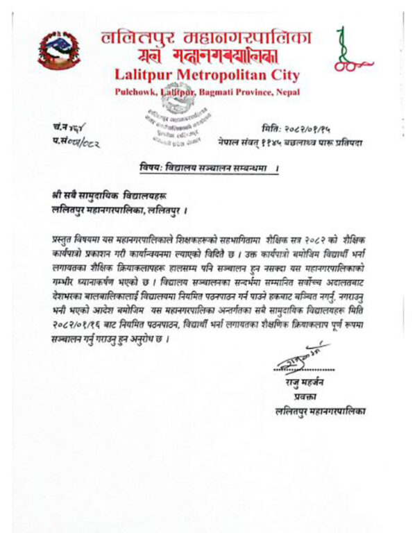 ललितपुर । ललितपुर महानगरपालिकाले मंगलबारदेखि सबै विद्यालय सामुदायिक खोलेर पठनपाठन अगाडि बढाउन निर्देशन दिएको छ । महानगरपालिकाका प्रवक्ता राजु महर्जनले मातहतका सबै सामुदायिक विद्यालयलाई मंगलबारदेखि नै नयाँ शैक्षिक सत्रको पढाई अघि बढाउन परिपत्र गरेका हुन् ।
