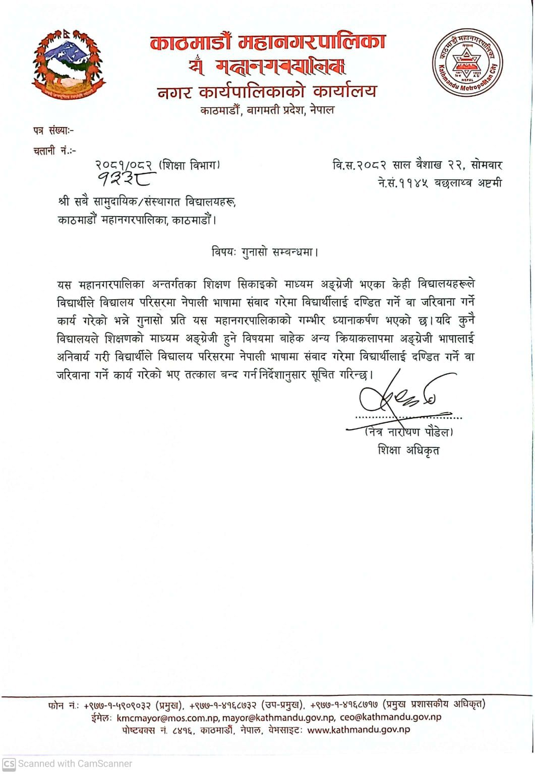 महानगरका शिक्षा अधिकृत नेत्र नारायण पौडेलले जारी गरेको विज्ञप्तिमा कुनै विद्यालयले शिक्षणको माध्यम अंग्रेजी हुने विषयमा बाहेक अन्य क्रियाकलापमा अंग्रेजी भाषालाई अनिवार्य गरी नेपाली भाषा बन्देज गर्ने कार्य तत्काल बन्द गर्न भनिएको छ ।