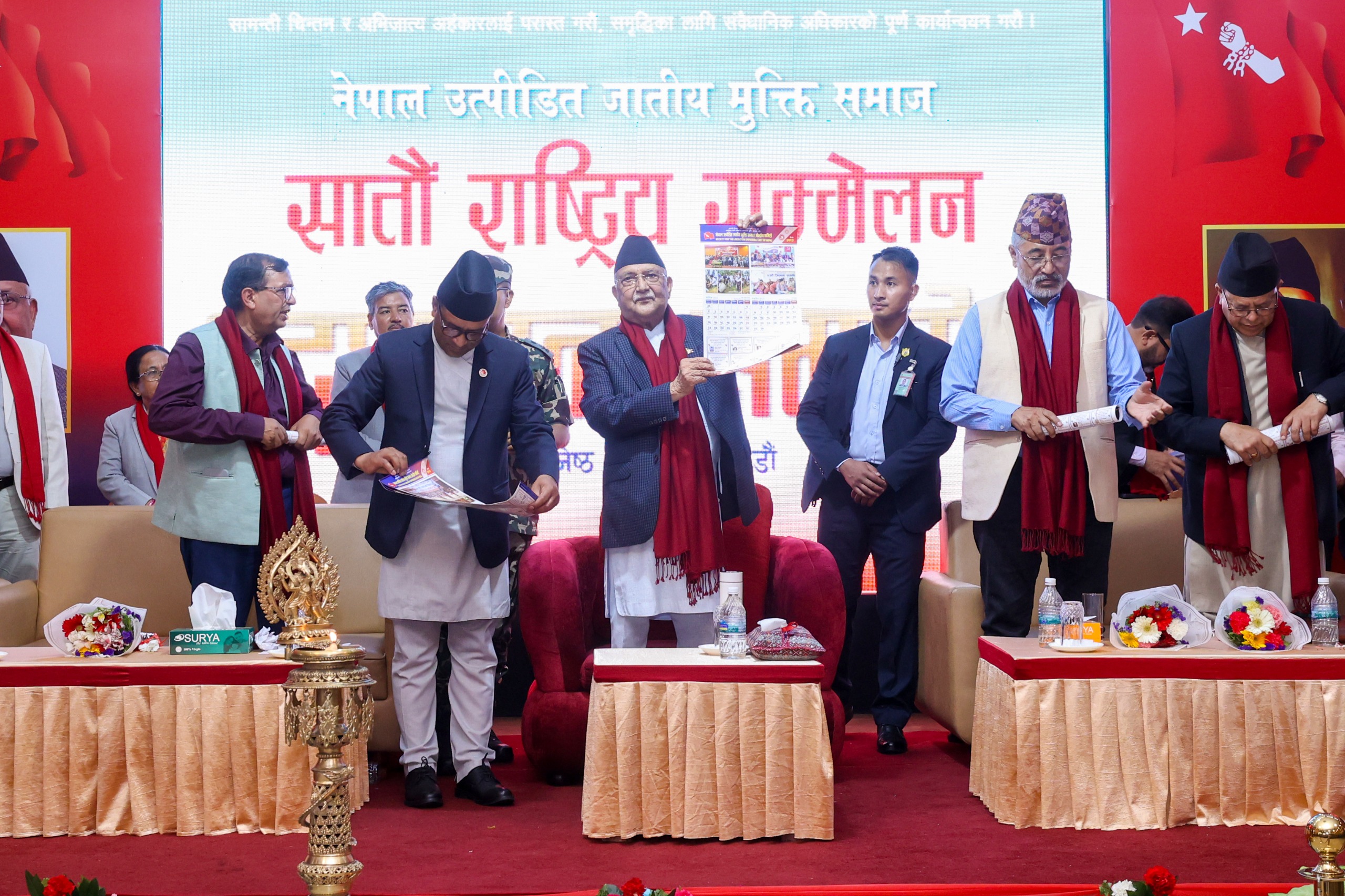 नेपाल उत्पीडित जातीय मुुक्ति समाजको सातौँ राष्ट्रिय महाधिवेशनको आज उद्घाटन गर्दै प्रधानमन्त्री ओलीले विकास र सुशासनको मार्गमा मुलुुकलाई तीव्रताका साथ अघि बढाउन एमाले निर्णायक राष्ट्रिय शक्ति बन्नुु अत्यावश्यक भएको बताएका हुन् ।