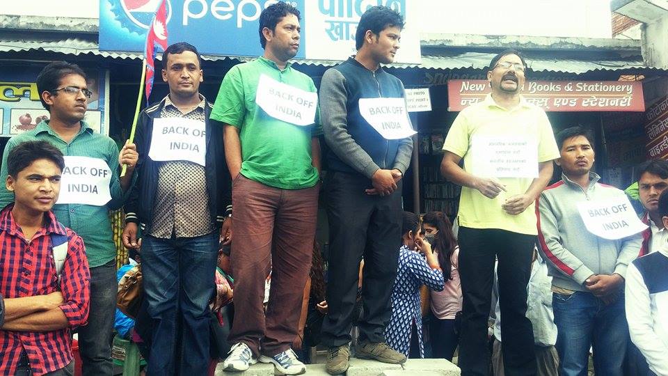 \"brikutimandap\"काठमाडौं । नेपालको आन्तरिक मामलामा छिमेकी राष्ट्र भारतले अनावश्यक हस्तक्षेप गरेको भन्दै सामाजिक संजालमार्फत बिहिवार काठमाडौंको भृकूटीमण्डपमा युवाहरुले स्वतस्फूर्त प्रदर्शन गरेका छन् । बुधबार नेपालका नाकाहरुमा भारतले नाकाबन्दी लगाएको भन्दै सामाजिक संजालहरुमा चर्को विरोध भएको थियो । सोही संजाल मार्फत केही स्वतन्त्र युवा तथा विभिन्न राजनीतिक पार्टीसम्बद्ध युवाहरुले बिहिवार विहान विरोध स्वरुप प्रदर्शन कार्यक्रमको आयोजना गरेका थिए । ‘व्याकअप इण्डिया’ लेखेको प्लेकार्ड छातिमा टाँसेर ‘आन्तरिक मामला हल गरौं, भारतीय हस्तक्षेपको विरोध गरौं’ भन्ने नारा समेत लगायका थिए । कार्यक्रममा बैद्य नेतृत्वको माओवादीका युवा नेता लेखनाथ न्यौपाने, एमालेसम्बद्ध विद्यार्थी नेता राजकूमार राई, एमाओवादी सम्बद्ध विद्यार्थी नेता रंजित तामाङ, बैद्य माओवादीसम्बद्ध विद्यार्थी नेता विरेन्द्र वस्नेत लगायतले भारतीय हस्तक्षेप स्विकार्य नहुने बताएका थिए । ती युवाहरुले आन्तरिक मामला आफै हल गर्ने तर भारतीय हस्तक्षेप अस्विकार्य हुने बताएका थिए । कार्यक्रम सामाजिक संजालमा आव्हान गरिएको थियो ।