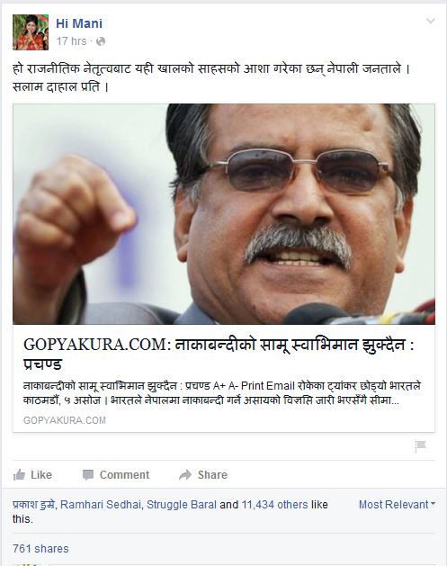 काठमाडाैं । भारतले नाकाबन्दी गरे त्यसको कडा प्रतिवाद गर्ने उद्घोष गरेका एमाओवादी अध्यक्ष पुष्पकमल दाहाल \"Himani\"प्रचण्डलाई पूर्व युवराज्ञी हिमानीले सलाम गरेकी छिन् ।   प्रचण्डको सार्वजनिक रुपमा भारतको यस्तो रवैयाप्रति कडा प्रतिवाद आएपछि एक अनलाइनले राखेको समाचार आफ्नो फेसबकु पेजमा सेयर गर्दै हिमानीले यस्तो भनेकी हुन् ।   हिमानी शाहको नाममा चलेको ७८ हजार लाइक रहेको यो पेजबाट उनले यो समाचार सेयर गर्दै राजनीतिक नेतृत्वबाट जनताले यस्तै साहसको आशा गरिएको भन्दै उनले सलाम दाहाल (प्रचण्ड) भनेकी हुन् ।‘हो राजनीतिक नेतृत्वबाट यही खालको साहसको आशा गरेका छन् नेपाली जनताले । सलाम दाहाल प्रति ।’ एक अनलाइनको समाचार सेयर गर्दै हिमानीले सेयर गरेको स्टाटसमा उल्लेख छ । \'Hi Mani\' नाम रहेको यो पेजमा उनका फोटो र समाचारहरु सेयर भएका देखिन्छन् । त्यस्तै सार्वजनिक व्यक्तित्व भन्दै हिमानी (Himani)को नाममा अर्को फेसबुक पेज पनि संचालित छ । सो पेजलाई एक ला ८९ हजार ९ सयले लाइक गरेका छन् । तर, हिमानीका नाममा चलेका दुवै फेसबुक पेज भेरिफाइड भने छैनन् ।  यी फेसबुक पेजमा उनकै फोटा र गतिविधि आएका छन् । तर, उनी आफैंले चलाएकी हुन् की होइनन् भन्ने खुल्दैन ।   प्रचण्डलाई सलाम गरिएको उनको पोस्टलाई ११ हजार बढीले लाइक गरेका छन् । त्यस्तै, ७६१ जनाले सेयर गरेका छन् । हिमानीले १७ घण्टा यो स्टाटस पोस्ट गरेकी हुन् ।