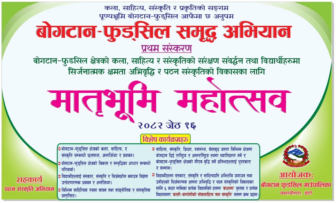 दिपायल । डोटीको बोगटान फुड्सिल गाउँपालिकामा बोगटान समृद्ध अभियानअन्तर्गत 'मातृभूमि महोत्सव' सम्पन्न भएको छ।