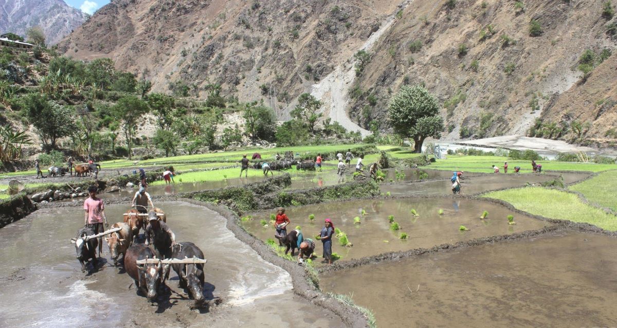 हुम्ला । हुम्लाको दक्षिणी क्षेत्र अदानचुली गाउँपालिकाको गल्फागाडस्थित खेतमा धान रोपाइँ गर्दै किसान ।
