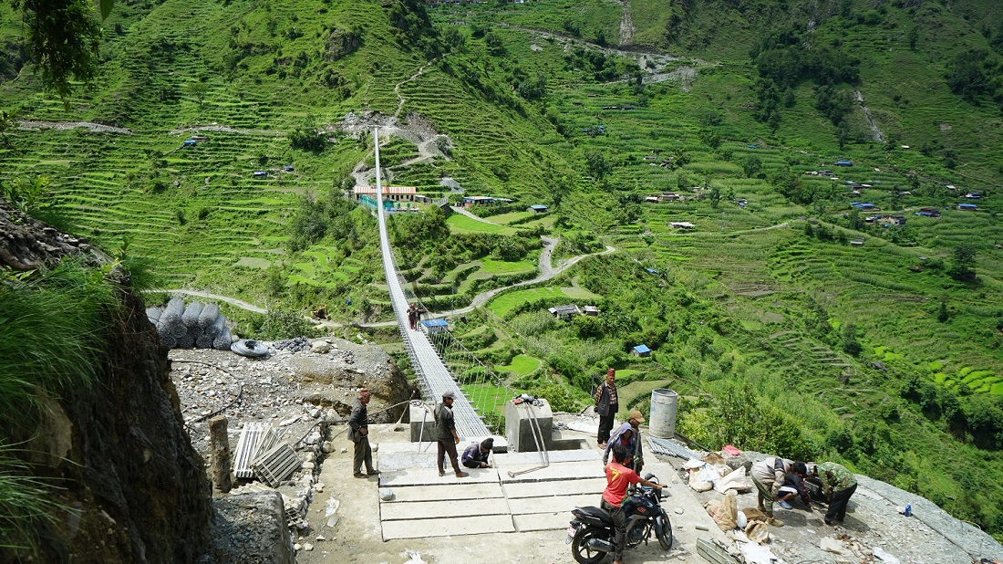 म्याग्दी । म्याग्दीको धौलागिरि गाउँपालिका–३ मुना फलीयागाउँ र दर जोड्ने दरखोलामाथि रु दुई करोड ३१ लाख ३६ हजार ७५० को लागतमा ३६६ मिटर लामो झोलुङ्गे पुल निर्माण भएको छ।