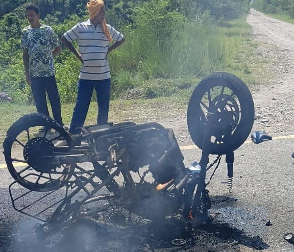 दुर्घटनापछि मोटरसाइकलमा आगलागी भएको प्रहरीले जनाएको छ । सोमबार बिहान पौने ११ बजेतिर बाँके–सङ्ग्रामपुर सडकखण्डमा श्रीनगरबाट बाँके चोकतर्फ आउँदै गरेको प्रदेश ०३–०२८ प २१९१ नम्बरको मोटरसाइकल र रेल्वे ट्रयाक हुँदै बयलवासबाट बाँके खोलातर्फ जाँदै गरेको बा। ८ च ६५ नम्बरको पिकअप आपसमा ठोक्किएका इलाका प्रहरी कार्यालय केशरगञ्जले जनाएको छ ।