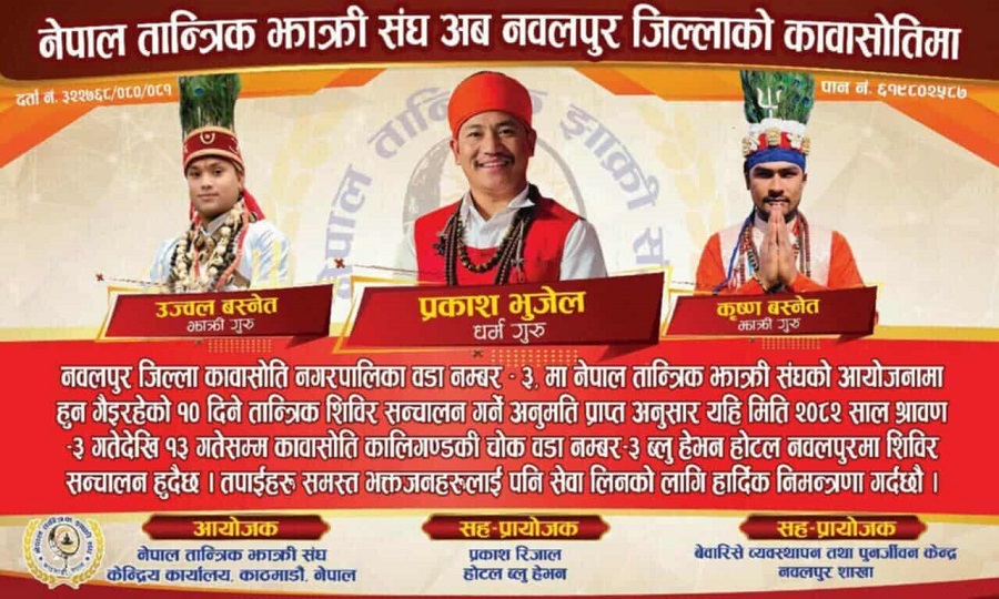 नवलपुरको कावासोती–३ मा १० दिनसम्म तान्त्रिक शिविर सञ्चालन गरेर बिरामीको उपचार गरिने नेपाल लोकतान्त्रिक झाँक्री सङ्घका केन्द्रीय अध्यक्ष प्रकाश भुजेलले बताउनुभयो । कार्यक्रम गर्नका लागि झाँक्री सङ्घलाई जिल्ला प्रशासन कार्यालय, जिल्ला प्रहरी कार्यालय र कावासोती नगरपालिका वडा नं। २ र ३ ले अनुमति दिएको भुजेलको दाबी छ ।