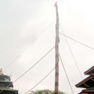 \"in1\"भक्तपुर जङ्गलबाट ल्याइएको लिङ्गो विधिपूर्वक पूजा गरी हनुमानढोका अगाडि इन्द्रध्वजा फराएपछि यसवर्षको इन्द्रजात्रा शुक्रबारबाट सुरु भएको छ । तस्बिरः  कृष्णराज गौतम, रासस