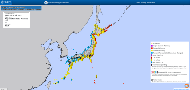 टोकियो। रुसको कामचटका प्रायद्वीप नजिक समुद्रमा बुधबार बिहान ८.८ म्याग्निच्युडको शक्तिशाली भूकम्प आएपछि जापानको प्रशान्त महासागर तटीय क्षेत्रमा सुनामीको असर देखिएको छ। जापान मौसम विभागले सुनामीको उचाइ ३ मिटरसम्म पुग्न सक्ने चेतावनी दिँदै उच्च सतर्कता अपनाउन आग्रह गरेको छ।