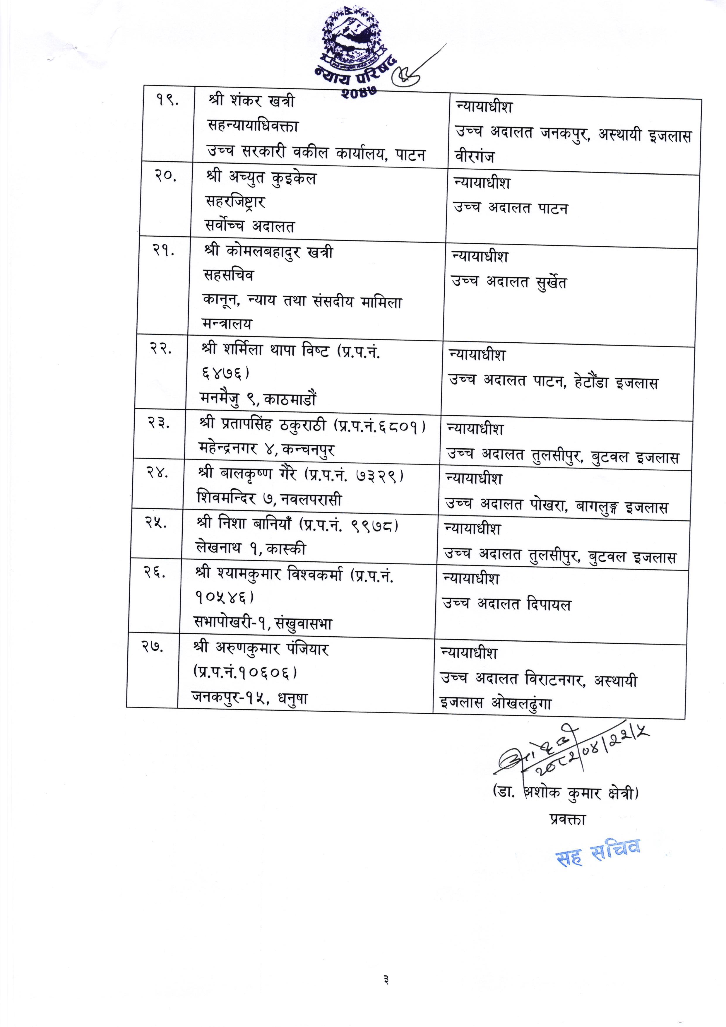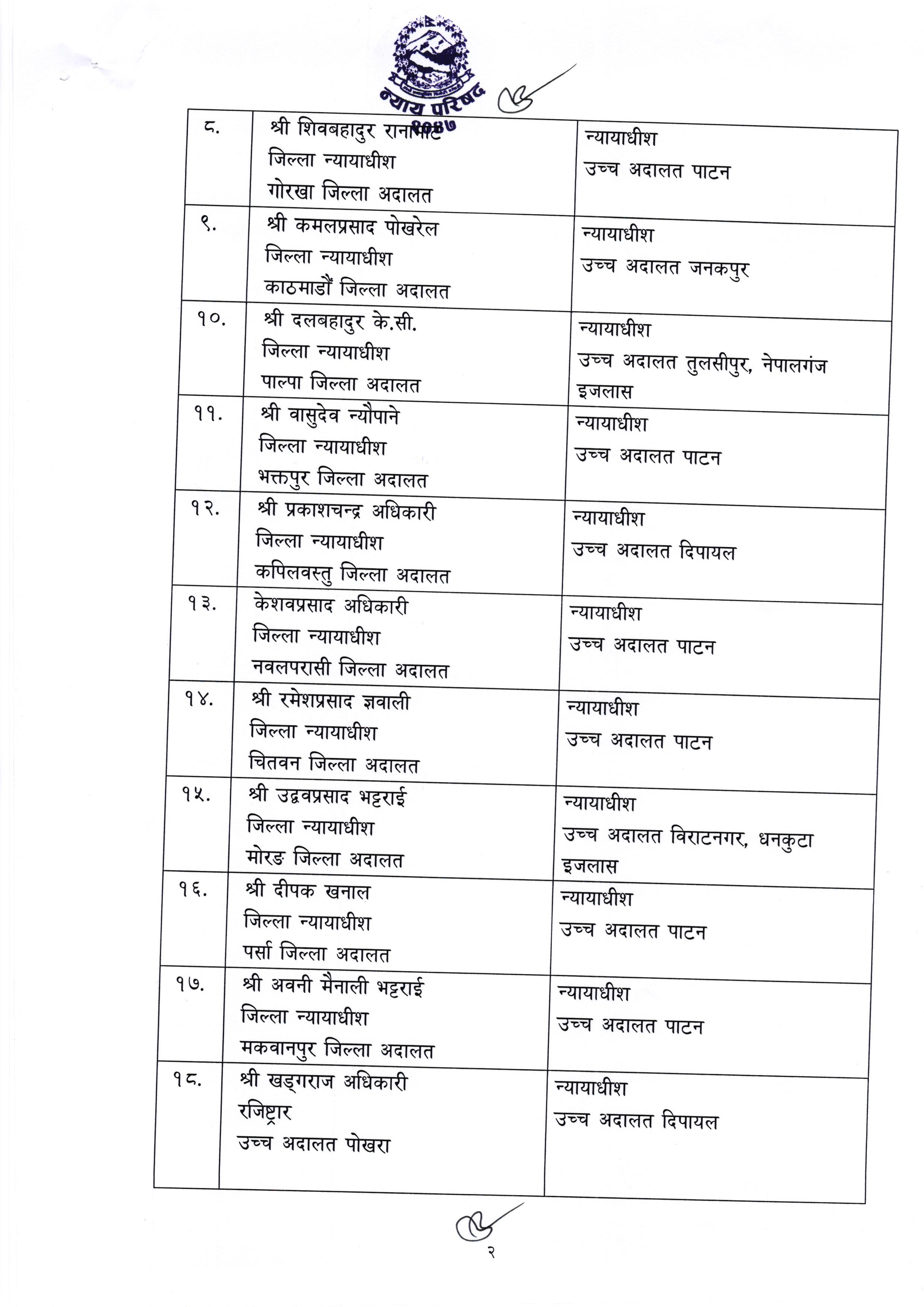 सिफारिस सूचीको पहिलो नम्बरमा न्याय परिषद्का सचिव याम बहादुर बुढा छन् । सिफारिस भएकाहरूलाई प्रधानन्यायाधीशले नियुक्त गर्नेछन् ।