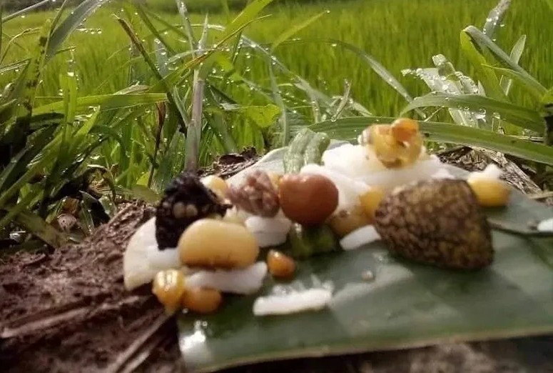 भक्तपुर । जनैपूर्णिमाको दिन भक्तपुरका नेवार किसानहरू खेतमा भ्यागुतालाई भात खुवाउन व्यस्त हुन्छन् । गोलाकार काटिएको मूलाको चाना सिन्काले घोचेर भातमा अड्याइन्छ ।