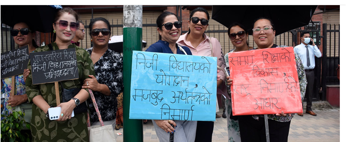 उनीहरूले ‘गैरनाफामूलक चाहिँदैन, कम्पनी मास्न पाइँदैन’, ‘पूर्ण छात्रवृत्ति लाद्न पाइँदैन, निजी विद्यालय मास्न पाइँदैन’, ‘निजी विद्यालयको योगदान, मजबुत अर्थतन्त्रको निर्माण’, ‘अभिभावकको पहिलो रोजाइ, निजी विद्यालयको पढाइ’ लगायतका प्लेकार्ड बोकेर उनीहरूले प्रदर्शन गरेका हुन् ।