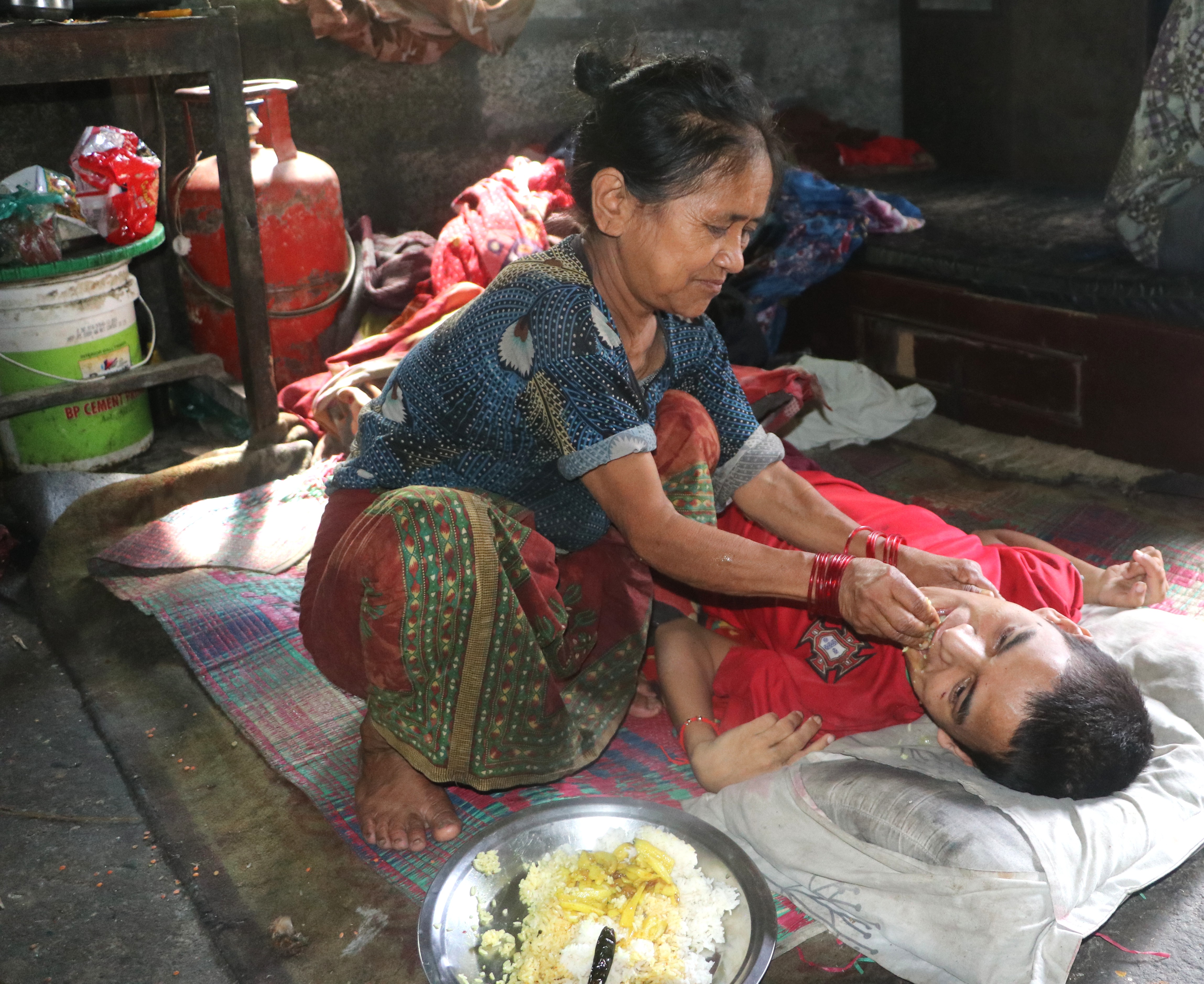 “छोरो सानो हुँदा त दिसापिसाब गर्न बोकेर शौचालय लैजान्थेँ । अब त छोरो ठूलो भयो, मेरो पनि उमेर ढल्कँदो छ । बोक्नै सक्दिन”, उहाँले भन्नुभयो, “विस्तारामै फोहर गर्छ । जति सफा गरेपनि पुग्दैन । हिजोआज त कोठा नै गन्हाउन थालेको छ ।”