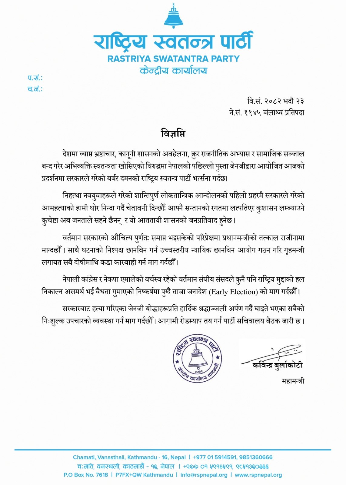 बैठकपछि महामन्त्री कविन्द्र बुर्लाकोटीले जारी गरेको विज्ञप्तिमा भनिएको छ, वर्तमान सरकारको औचित्य पुर्णतस् समाप्त भइसकेको परिप्रेक्षमा प्रधानमन्त्रीको तत्काल राजीनामा माग्दछौँ । साथै घटनाको निश्पक्ष छानविन गर्न उच्चस्तरीय न्यायिक छानविन आयोग गठन गरि गृहमन्त्री लगायत सबै दोषीमाथि कडा कारबाही गर्न माग गर्दछौँ ।