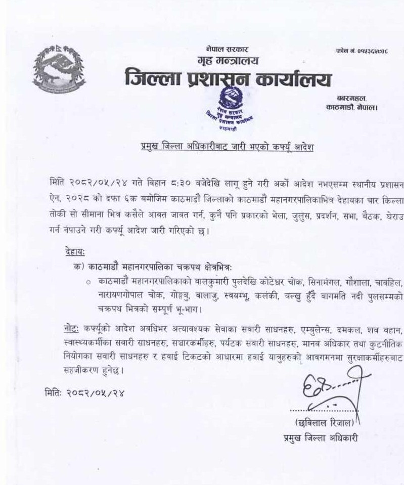 काठमाडौं महानगरपालिकाको बालकुमारी पुलदेखि कोटेश्वर चोक, सिनामंगल, गौशाला, चाबहिल, नारायणगोपाल चोक, गोङ्गबु, बालाजु, स्वयम्भू, कलंकी, बल्खु हुँदै वागमति नदी पुलसम्मको चक्रपथ भित्रको सम्पूर्ण भू-भागमा कर्फ्यू आदेश जारी गरिएको उल्लेख छ।