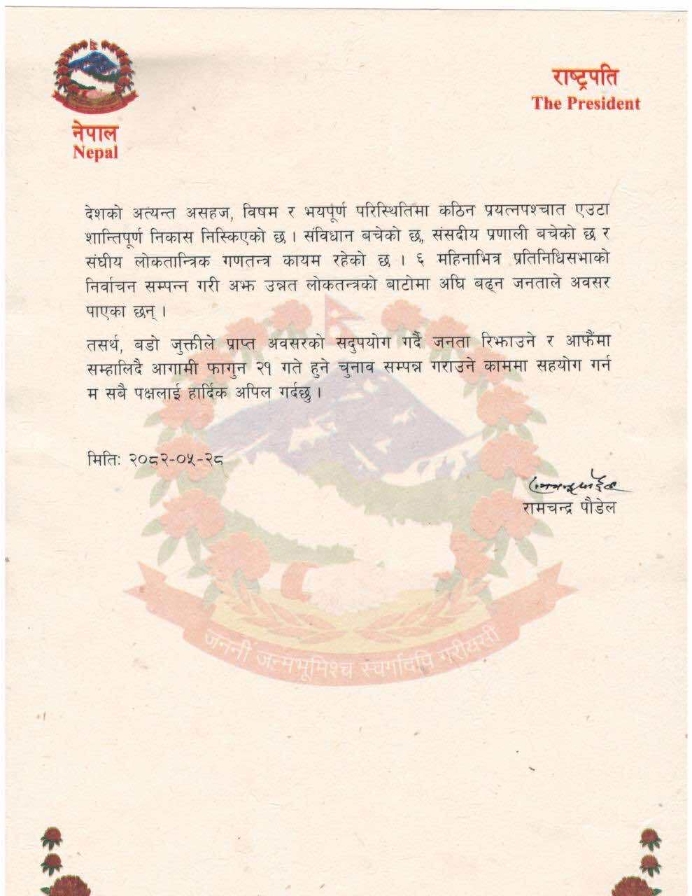 राष्ट्रपति पौडेलले भनेका छन्, “देशको अत्यन्त असहज र भयपूर्ण अवस्थाबीच ठूलो प्रयासपछि शान्तिपूर्ण निकास प्राप्त भएको छ। संविधान, संसदीय प्रणाली र संघीय लोकतान्त्रिक गणतन्त्र जोगिएको छ। अब ६ महिनाभित्र हुने प्रतिनिधिसभा निर्वाचनमार्फत जनताले अझ सुदृढ लोकतन्त्रतर्फ अघि बढ्ने अवसर पाएका छन् ।”