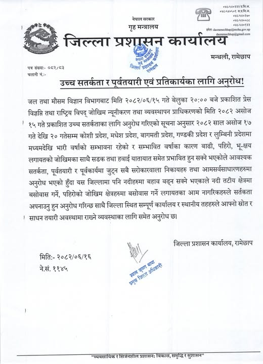रामेछाप । जल तथा मौसम विज्ञान विभागले असोज १५ देखि १७ गतेसम्म देशका विभिन्न स्थानमा भारी वर्षा हुने सम्भावना जनाएको छ। यसै सन्दर्भमा जिल्ला प्रशासन कार्यालय रामेछापले जनतालाई उच्च सतर्कता अपनाउन आग्रह गरेको छ।